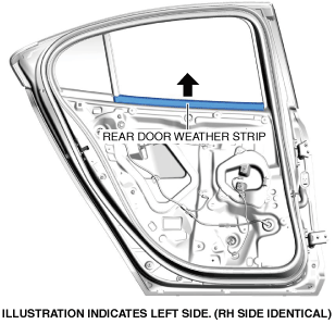 4.Remove the rear door weatherstrip in the direction of the arrow shown in the figure by pulling it upward.