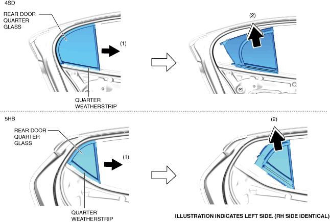 20.Slide the rear door quarter glass and quarter weatherstrip as a single unit in the direction of arrow (1) shown in the figure.