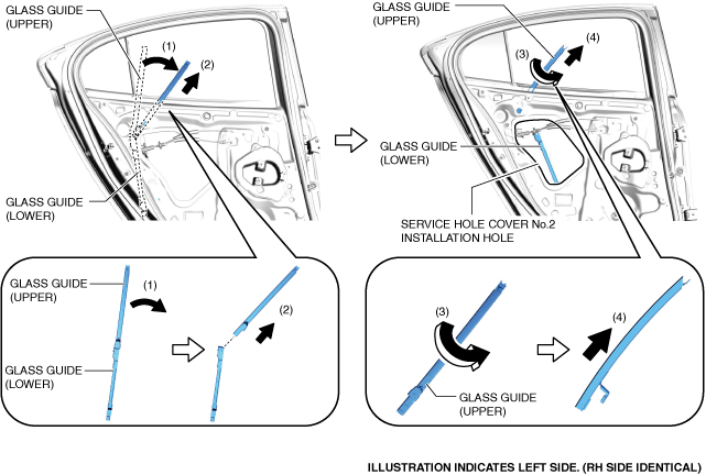 23.Install in the reverse order of removal. (See Glass Guide Installation Note.) (See Service Hole Cover No.2 Installation Note.)