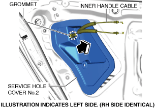9.Move service hole cover No.2 in the direction of the arrow shown in the figure and remove it while pulling out the inner handle cable.