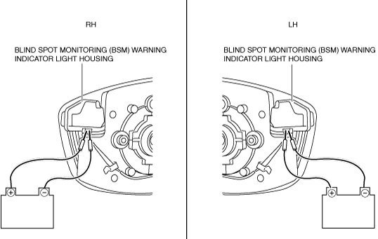 • If the blind spot monitoring (BSM) warning indicator light does not illuminate, replace the outer mirror glass. (See OUTER MIRROR GLASS REMOVAL.) (See OUTER MIRROR GLASS INSTALLATION.)