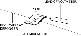 • Directly touching the rear window defogger with the lead of the tester could damage it. Wrap aluminum foil around the end of the lead and inspect the rear window defogger by touching it with the aluminum foil.