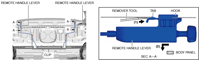 3.Insert the remover tool in the direction of arrow (1) shown in the figure and detach the remote handle lever tab from the body panel.