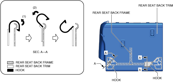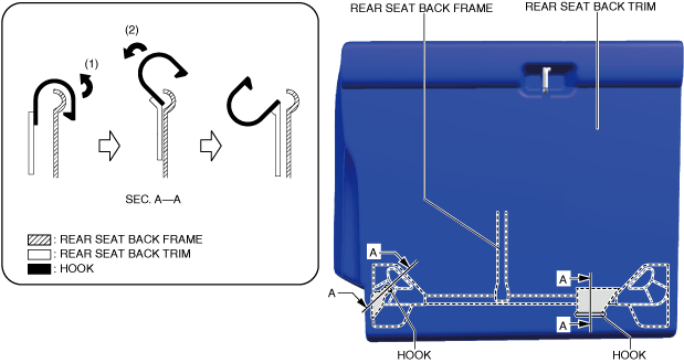 4.Move the hooks in the order of arrows (1) and (2) shown in the figure to detach the hooks from the rear seat back frame.
