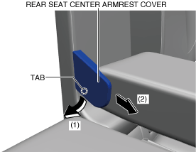 8.Pull the bottom part of the rear seat center armrest cover in the direction of arrow (1) shown in the figure to detach the tab.