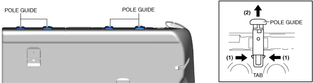 6.While pressing the tabs of the pole guides in the direction of arrows (1) shown in the figure, pull the pole guides in the direction of arrow (2) and remove the pole guides from the front seat back frame.
