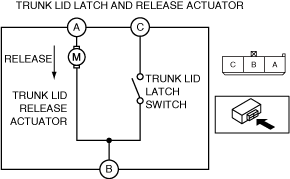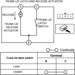 • If not as indicated in the table, replace the trunk lid latch and release actuator. (See TRUNK LID LATCH AND RELEASE ACTUATOR REMOVAL/INSTALLATION.)