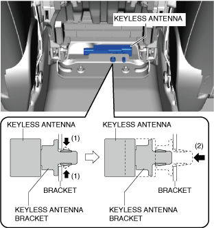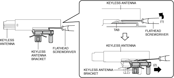 4.While pressing the keyless antenna bracket tab in the direction of arrow (1) shown in the figure, press it in the direction of arrow (2) to detach the keyless antenna bracket tab from the bracket.