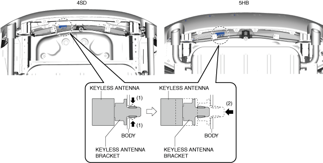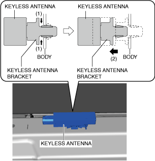 3.While pressing the keyless antenna bracket tab in the direction of arrow (1) shown in the figure, press it in the direction of arrow (2) to detach the keyless antenna bracket tab from the body.