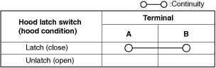• If the operation as indicated in the table cannot be verified, replace the hood latch. (See HOOD LATCH REMOVAL/INSTALLATION.)
