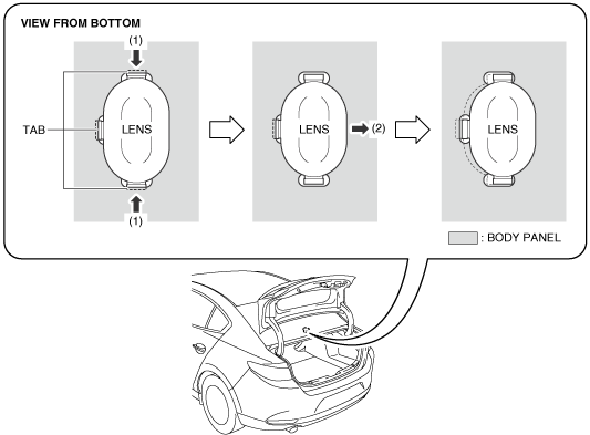 2.While pressing the lens in the direction of arrows (1) shown in the figure, move the lens in the direction of arrow (2) to detach the lens tabs from the body panel.