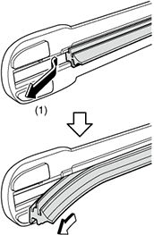 3.Pull the end of the windshield wiper blade rubber from the blade holder groove in the direction of arrow (1) and remove the windshield wiper blade rubber from the blade holder.