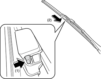 3.While pressing the windshield wiper arm tab in the direction of arrow (1) shown in the figure, move the windshield wiper blade in the direction of arrow (2) and remove the windshield wiper blade from the windshield wiper arm.
