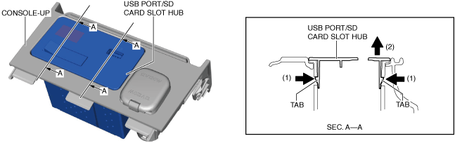 3.While pressing the tabs of the USB port/SD card slot hub in the direction of arrows (1) shown in the figure, move the USB port/SD card slot hub in the direction of arrow (2) and detach the tabs of the USB port/SD card slot hub from the console-up.