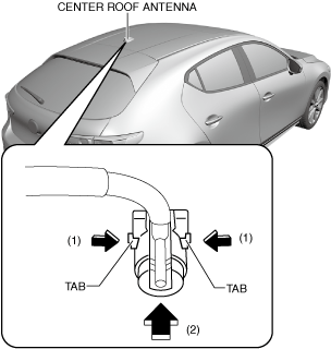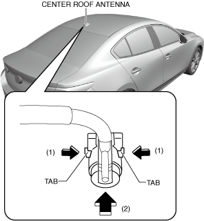 6.While pressing the center roof antenna tabs in the direction of arrows (1) shown in the figure, press the center roof antenna in the direction of arrow (2) to detach the center roof antenna tabs from the body.