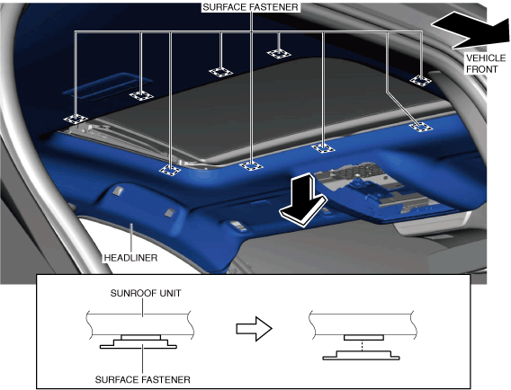 7.Move the headliner in the direction of the arrow shown in the figure and detach the surface fasteners from the sunroof unit. (with sunroof system)