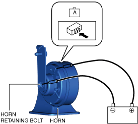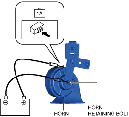 3.Apply battery positive voltage to horn terminal, and connect the horn retaining bolt to ground as shown in the figure, and then verify that the horn sounds.