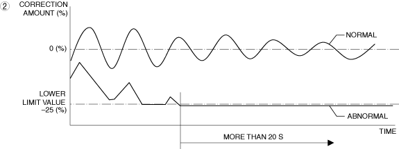 2. The fuel feedback correction amount reaches the lower limit ( −25% or less) for 20 s or more. Engine coolant temperature: 0—45 °C {32—113 °F}, 60 °C {140 °F} or more