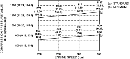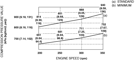 Standard: Refer to the graph.Minimum: Refer to the graph.Maximum difference between cylinders: 116 kPa {1.18 kgf/cm 2, 16.8 psi} [250 rpm]