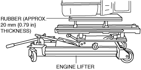 • When supporting the engine and transaxle, insert rubber of appropriate size (approx. 20 mm {0.79 in} thickness) between the engine lifter and the oil pan, transaxle to prevent the deformation of the oil pan and damage of the transaxle.