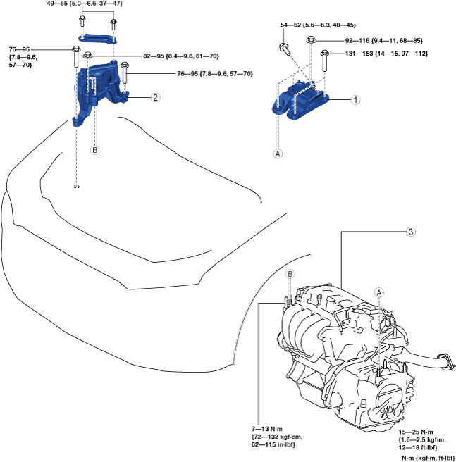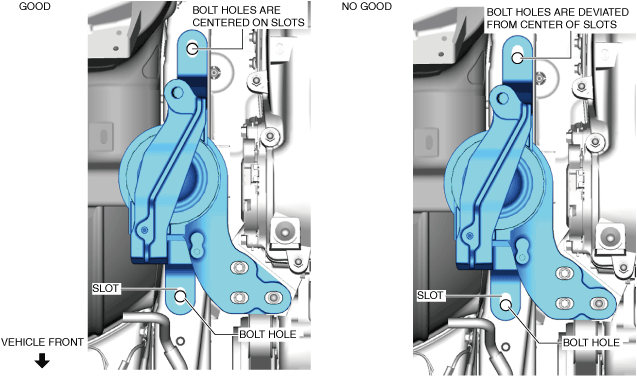 • Slots have been adopted for the No.3 engine mount and No.4 engine mount bracket installation holes. Tighten the installation bolts and nuts so that they are centered on the slots. Otherwise, engine noise or vibration could increase.