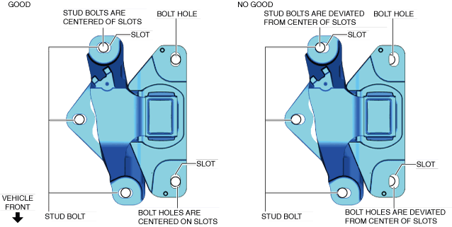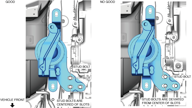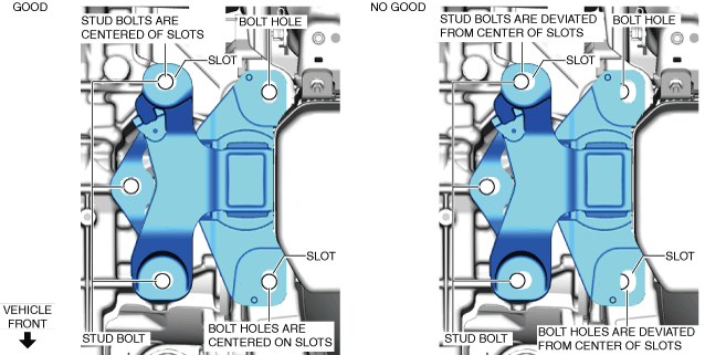 • If the stud bolts are deviated from the center of the slots, align the stud bolts with the center of the slots while slightly moving the transaxle, and temporarily tighten the installation nuts.