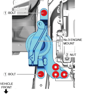 10.Tighten the No.3 engine mount installation bolts and nuts in the order shown in the figure.