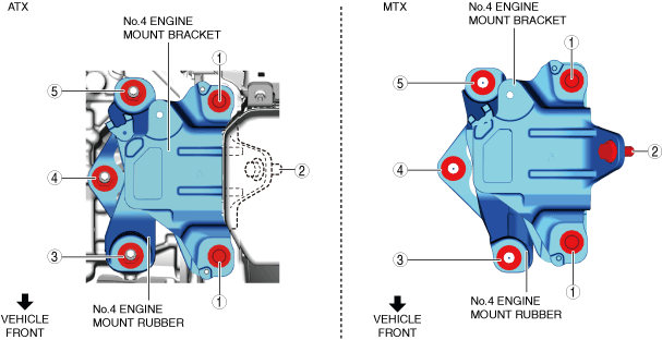 11.Tighten the No.4 engine mount bracket and rubber installation bolts and nuts in the order shown in the figure.