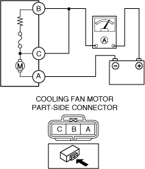 3.Install a tester and battery to the cooling fan motor connector (3 terminals) as shown in the figure.
