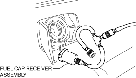 3.Connect the fuel cap receiver assembly (part of tester) to the manifold assembly and fuel-filler cap from the vehicle.