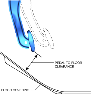 2.Measure the distance from the center of the upper surface of the pedal pad to the floor covering and verify that it is as specified.