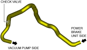 2.Verify that air can be blown from the power brake unit side of the vacuum hose towards the vacuum pump side, and that air cannot be blown in the opposite direction.