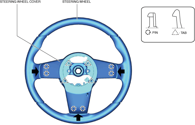 6.Pry the arrow areas shown in the figure and detach the steering wheel cover pins and tabs.