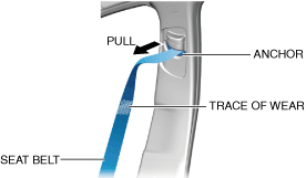 • When the load limiter operates, the belt and anchor rub against each other strongly leaving wear tracks. If the seat belt is used in this state, the seat belt will not function at its full capability and there is the possibility of serious injury to passengers. Always replace the seat belt once the load limiter operates.