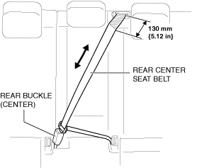 • The rear center seat belt ELR only becomes operable after a certain amount of belt webbing is pulled out. For the ELR inspection, fasten the rear center seat belt to the rear buckle (center) and perform the inspection after pulling out the rear center seat belt 130 mm {5.12 in} (ELR operable condition). If the inspection is performed while the ELR is not in an operable condition, the integrity of the system cannot be determined.
