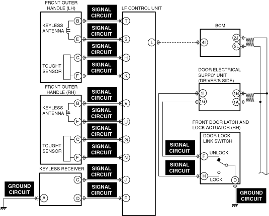 INSPECT FRONT OUTER HANDLE, KEYLESS RECEIVER, LF CONTROL UNIT, BCM, DOOR-ELECTRICAL SUPPLY UNIT (DRIVER’S SIDE), AND FRONT DOOR LATCH AND LOCK ACTUATOR (DRIVER’S SIDE) CONNECTORS FOR MALFUNCTION