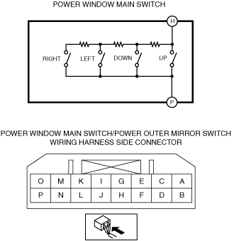 3.Verify that the resistance between power window main switch terminals H and P is as indicated in the table.