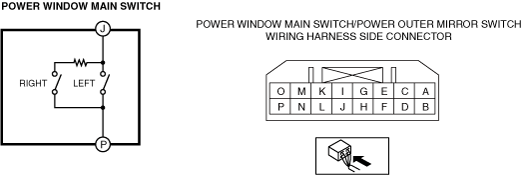 3.Verify that the resistance between power window main switch terminals J and P is as indicated in the table.