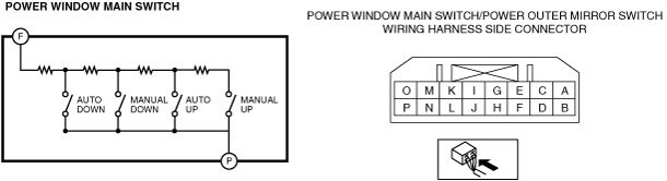 3.Verify that the resistance between power window main switch terminals F and P is as indicated in the table.
