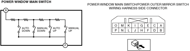 3.Verify that the resistance between power window main switch terminals B and P is as indicated in the table.