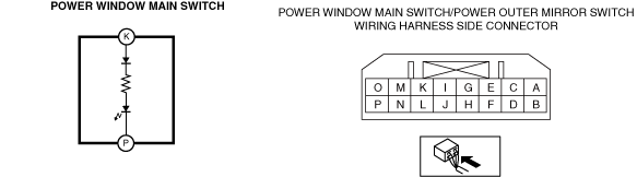 3.Verify that the resistance between power window main switch terminals A and P is as indicated in the table.