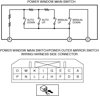 4.Verify that the continuity between the power window main switch terminals C and P is as indicated in the table.