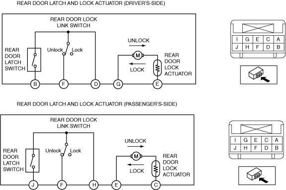 • If not as indicated in the table, replace the rear door latch and lock actuator. (See REAR DOOR LATCH AND LOCK ACTUATOR REMOVAL/INSTALLATION.)