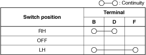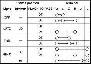 • If not as indicated in the table, replace the light switch. (See LIGHT SWITCH REMOVAL/INSTALLATION [(US)].)