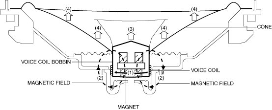 1. The speaker sends the audio signal (current) from the audio unit to the voice coil.2. When the audio signal (current) is sent to the voice coil, the coil becomes magnetized and a magnetic field occurs. Because the voice coil and the magnet pull and repel each other in the magnetic field, the voice coil vibrates.3. Because the voice coil is wrapped around the voice coil bobbin, the voice coil bobbin vibrates when the voice coil vibrates.4. When the voice coil bobbin vibrates, the cone (diaphragm) installed to the voice coil bobbin vibrates and generates sound.