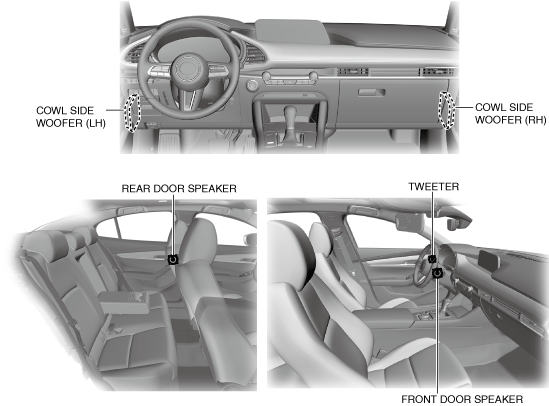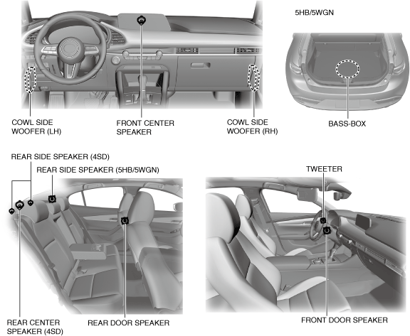 ― Front door speaker (speaker for all sound ranges)― Rear door speaker (speaker for all sound ranges)― Tweeter (speaker for medium-to-high-sound range)― Front center speaker (speaker for medium-to-high-sound range)― Rear center speaker (speaker for deep bass sound range) (4SD)― Rear side speaker (speaker for medium-to-high-sound range)― Cowl side woofer (speaker for deep bass sound range)― Bass-box (speaker for deep bass sound range) (5HB/5WGN)