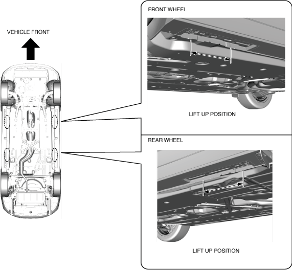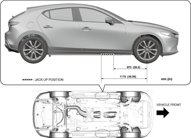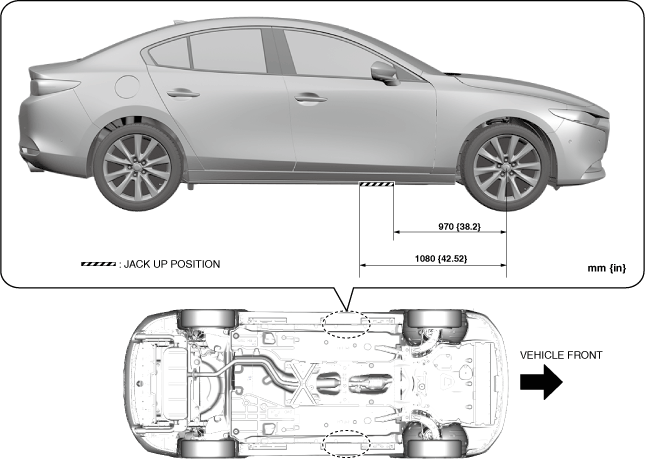 2.Set the jack to the center of the jack up position of the side sill on the right side shown in the figure and jack up the right front and rear wheels at the same time.
