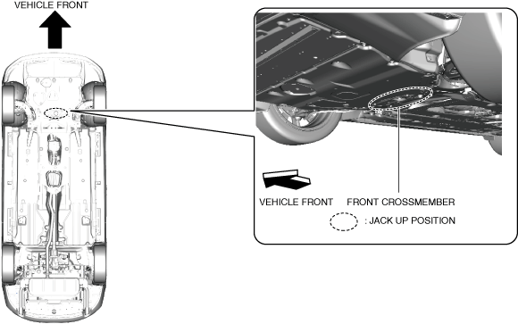 2.Set the jack to the jack up position of the front crossmember shown in the figure and jack up a front wheel.