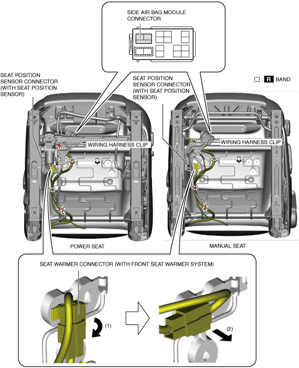10.Move the seat warmer connectors in the order of arrows (1) and (2) shown in the figure and remove the connectors.