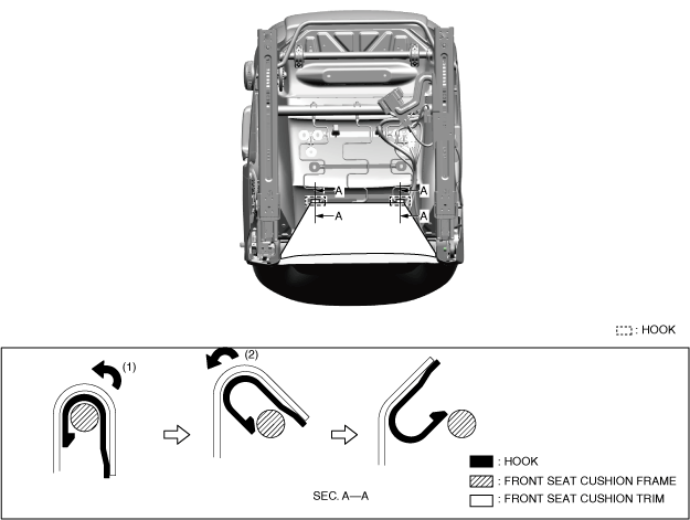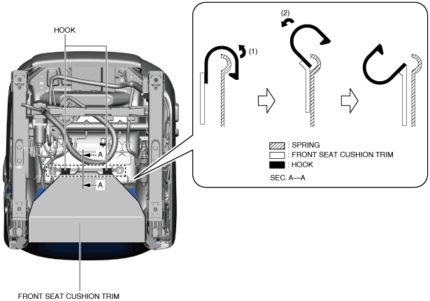 15.Move the hooks in the order of arrows (1) and (2) shown in the figure to detach the hooks from the front seat cushion frame.